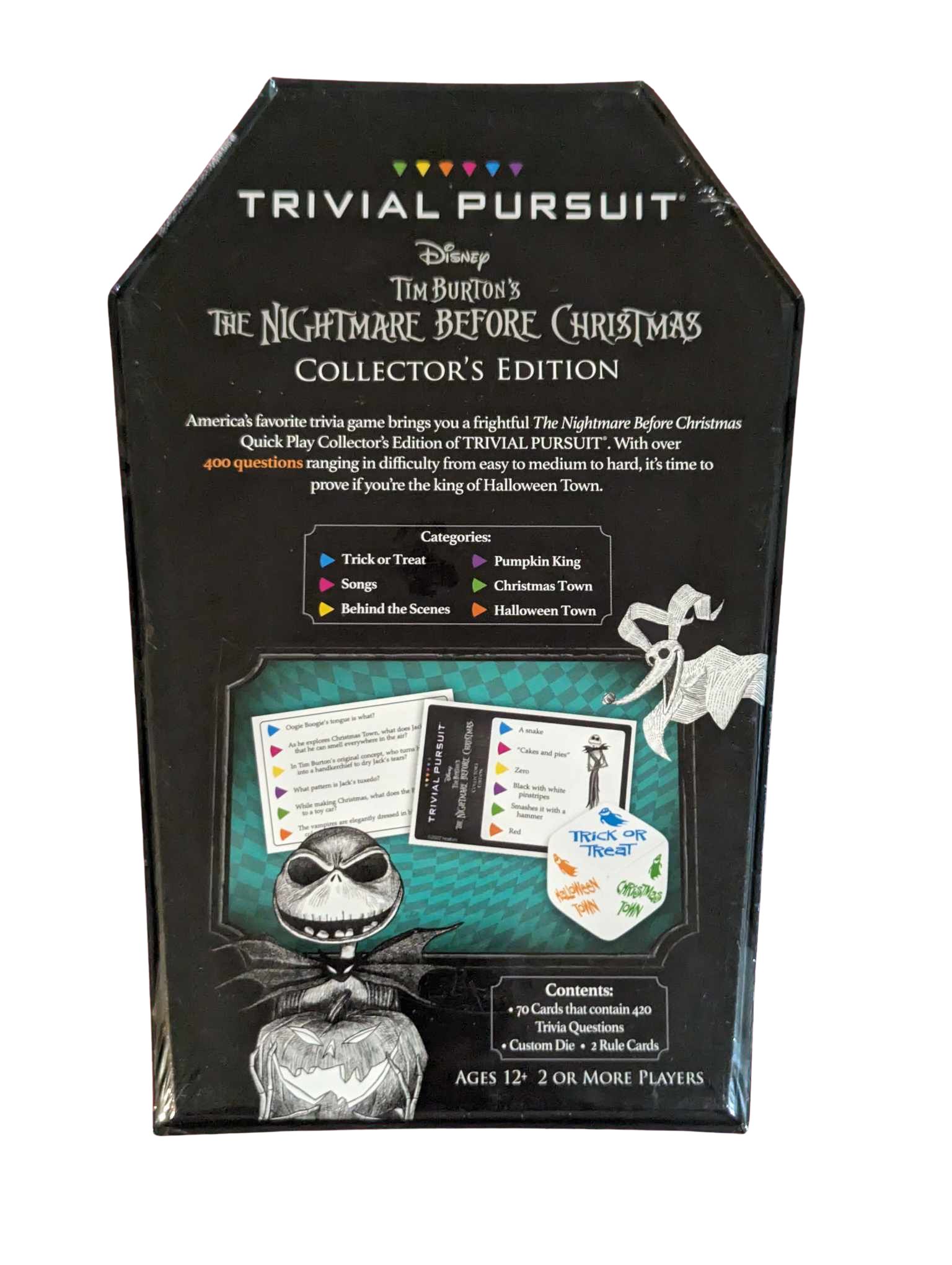 Tim Burton’s The Nightmare Before Christmas TRIVIAL PURSUIT is the first and only game where fans can test their knowledge of this cult classic with 420 trivia questions about the music, iconic movie characters, the Pumpkin King himself…and much more!
